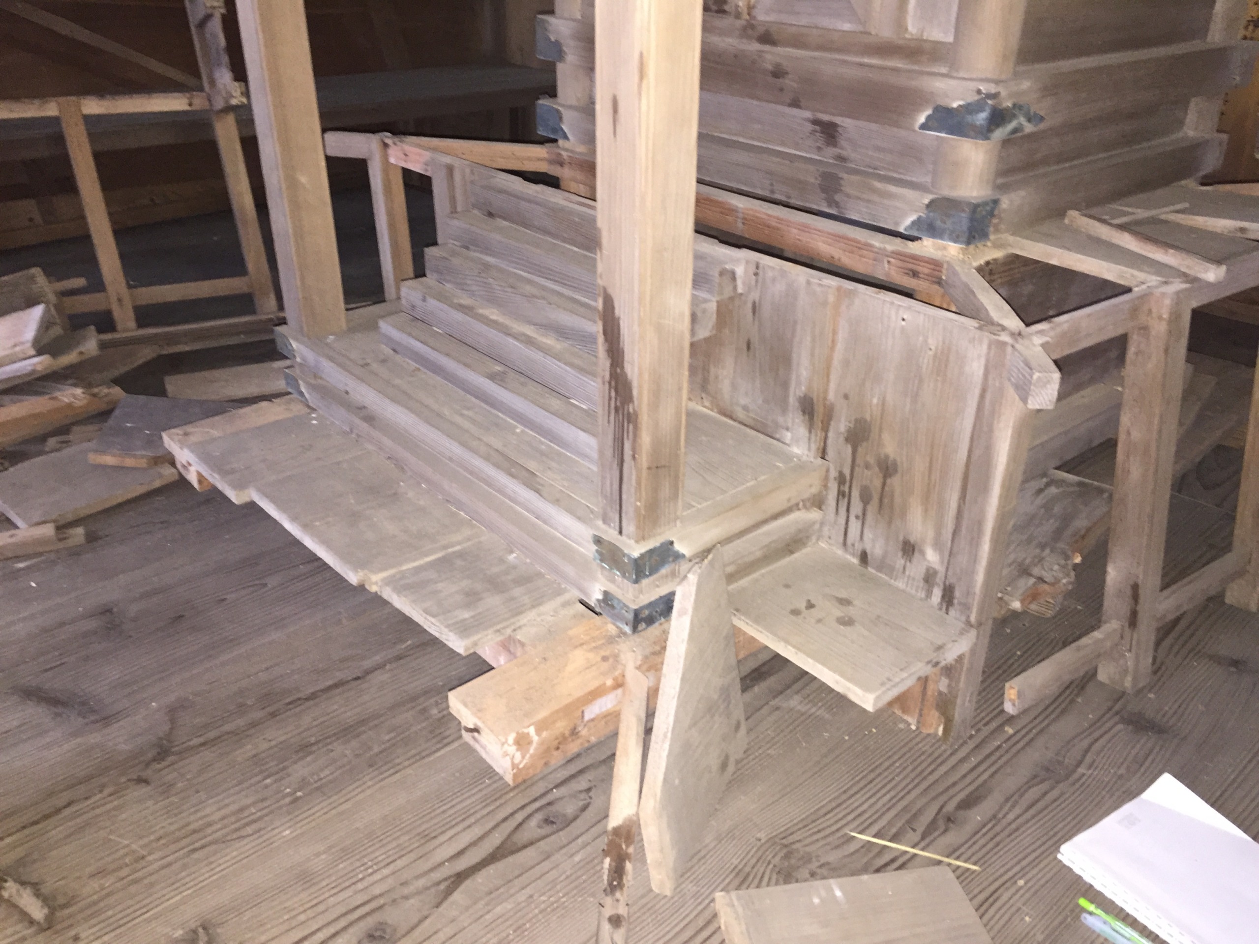 山頂にある稲荷神社の社殿経年劣化による腐食の修繕。 土台部分の損傷が激しく持ち出すことができないため2週間かけ現地神社内で作業。